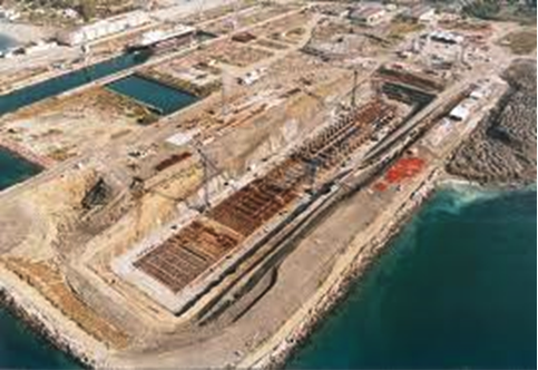 Alternatively, if a suitable shallow (4 to 6 metres deep) bay is available, a simple earth cofferdam may be constructed at its entrance to form a temporary polder or dry dock. The enclosed area is dewatered. All modules can be cast inside after suitably preparing the ground. When completed the area is flooded, the cofferdam is removed and the modules towed to site for connecting.