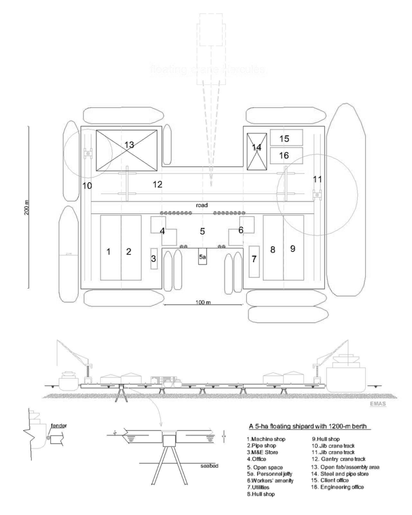 Fig. 7 illustrates the cross section of a smaller 5-hectare shipyard with an H-shape footprint. It shows a possible mooring arrangement. The layout is indicative of the type of shipyard equipment that may be erected on board, including gantry crane and quayside jib cranes. The floating crane shown to scale, shows how heavy objects may loaded or offloaded from the platform. The rectilinear shape permits a very efficient layout for a wide range of workshop and uncovered fabrication area. It has 240 metres of quay space per hectare of deck space. Such a layout is ideal for shipyards servicing the osv (offshore support vessel) sector. The illustration shows it can also accommodate larger vessels up to 200 metres.