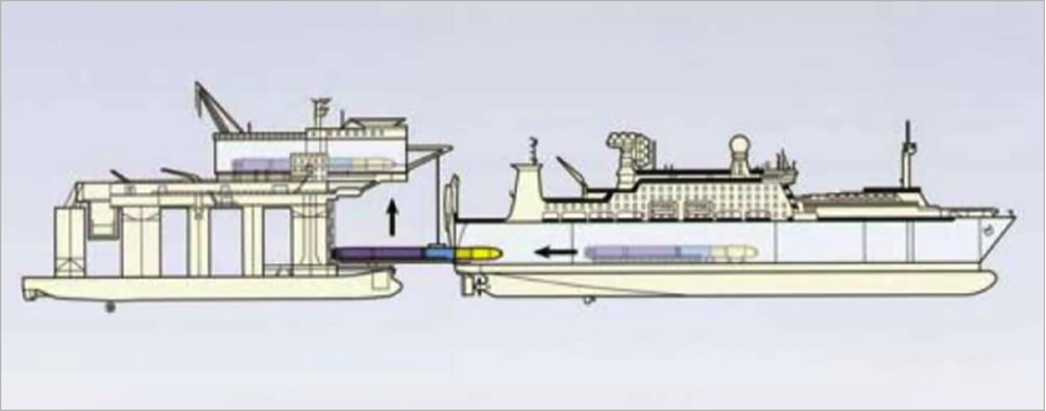 The skidding over of a rocket from a ship (Sea Launch Commander) to a launch pad (Odyssey) as shown schematically in Fig. 8, proves that skidding a load from one floating structure to another is not impossible. Similarly a newbuilding may be transferred (preferably in the longitudinal direction of the platform for stability) across to a floating dock. The floating dock is then submerged, causing the newbuilding to float. Of course, such a procedure should be analysed to ensure that any bending moment induced on the platform can be mitigated or is within the safe limits of the float.