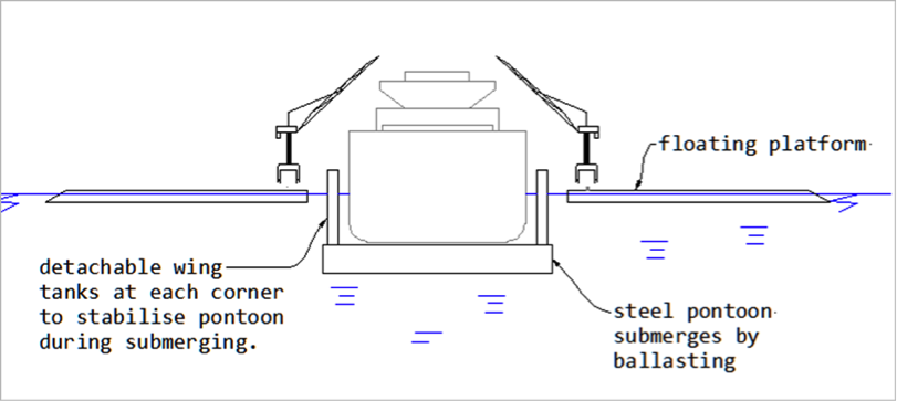 An alternative method of launching without the use of floating dock may be investigated. One procedure may be to design the float where the newbuilding assembly area is provided by a steel pontoon, which lies within the footprint of the floating platform. The pontoon is fitted with ballast pumps and may be ballasted to submerge it independently of the rest of the platform and to the extent necessary to float the new vessel. See Fig. 9. To maintain stability when the pontoon deck submerges below the water line, detachable wing tanks may be fixed to maintain the metacentre above the centre of gravity. When not in use the wing tanks may be removed so as not to obstruct activities.