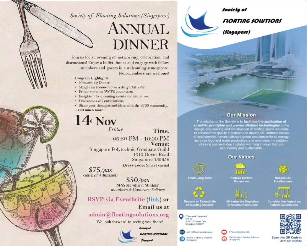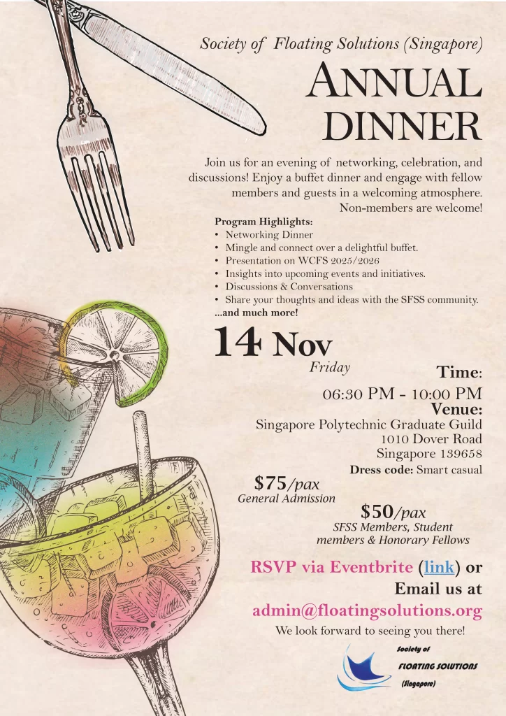 Join us for the Annual Dinner of the Society of Floating Solutions (SFSS) on Friday, 14 November 2025 at the Singapore Polytechnic Graduate Guild (SPGG).